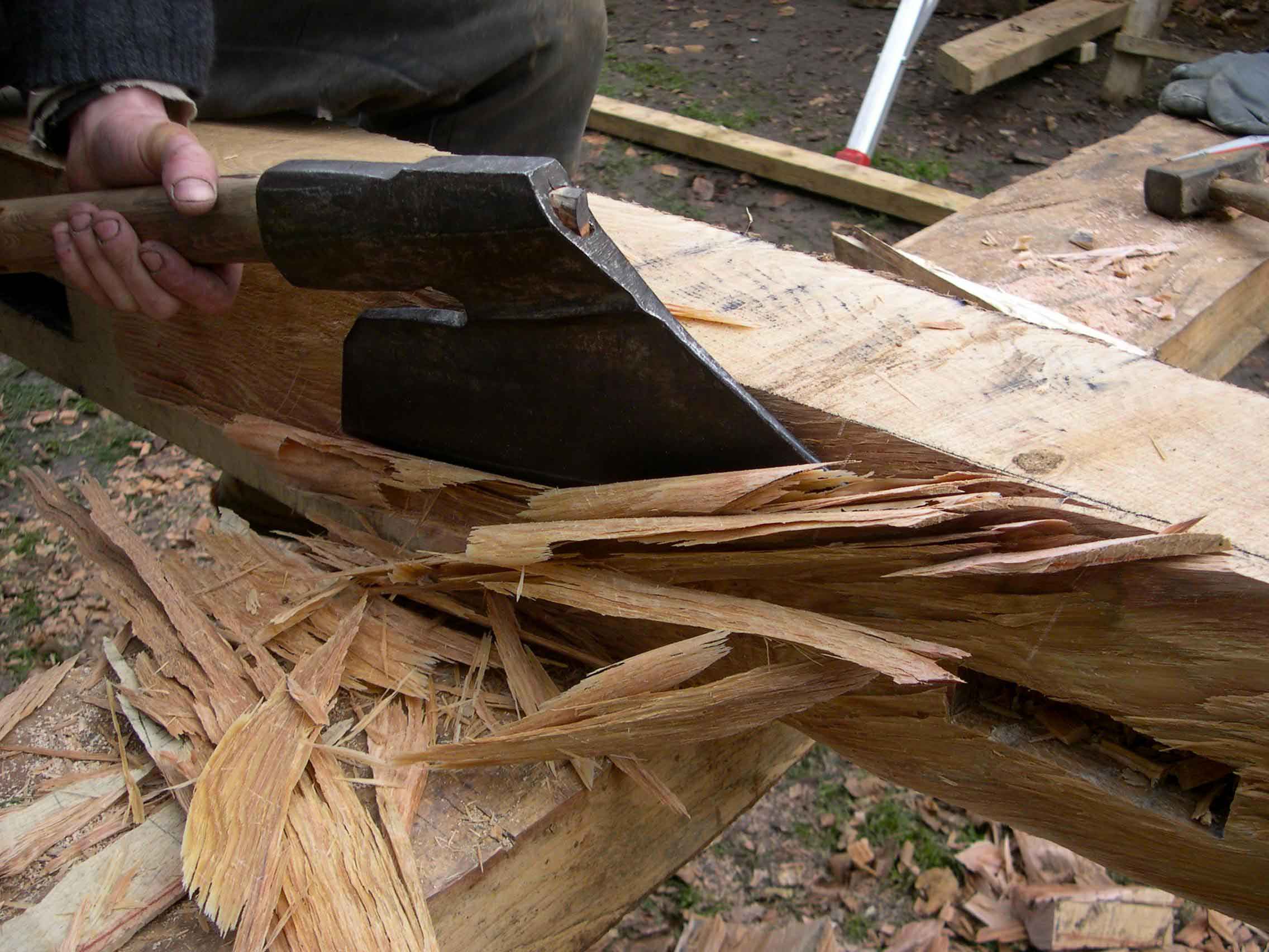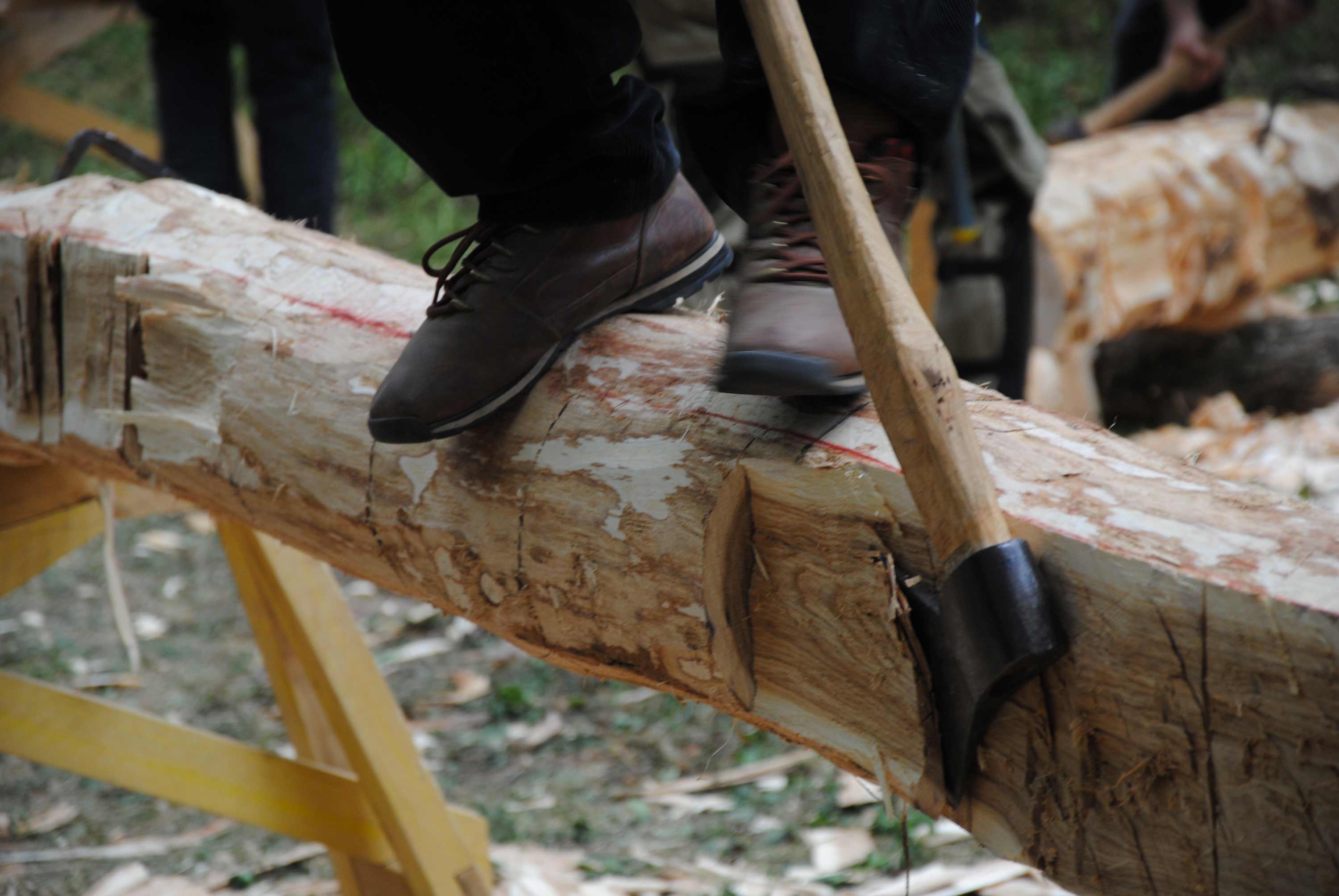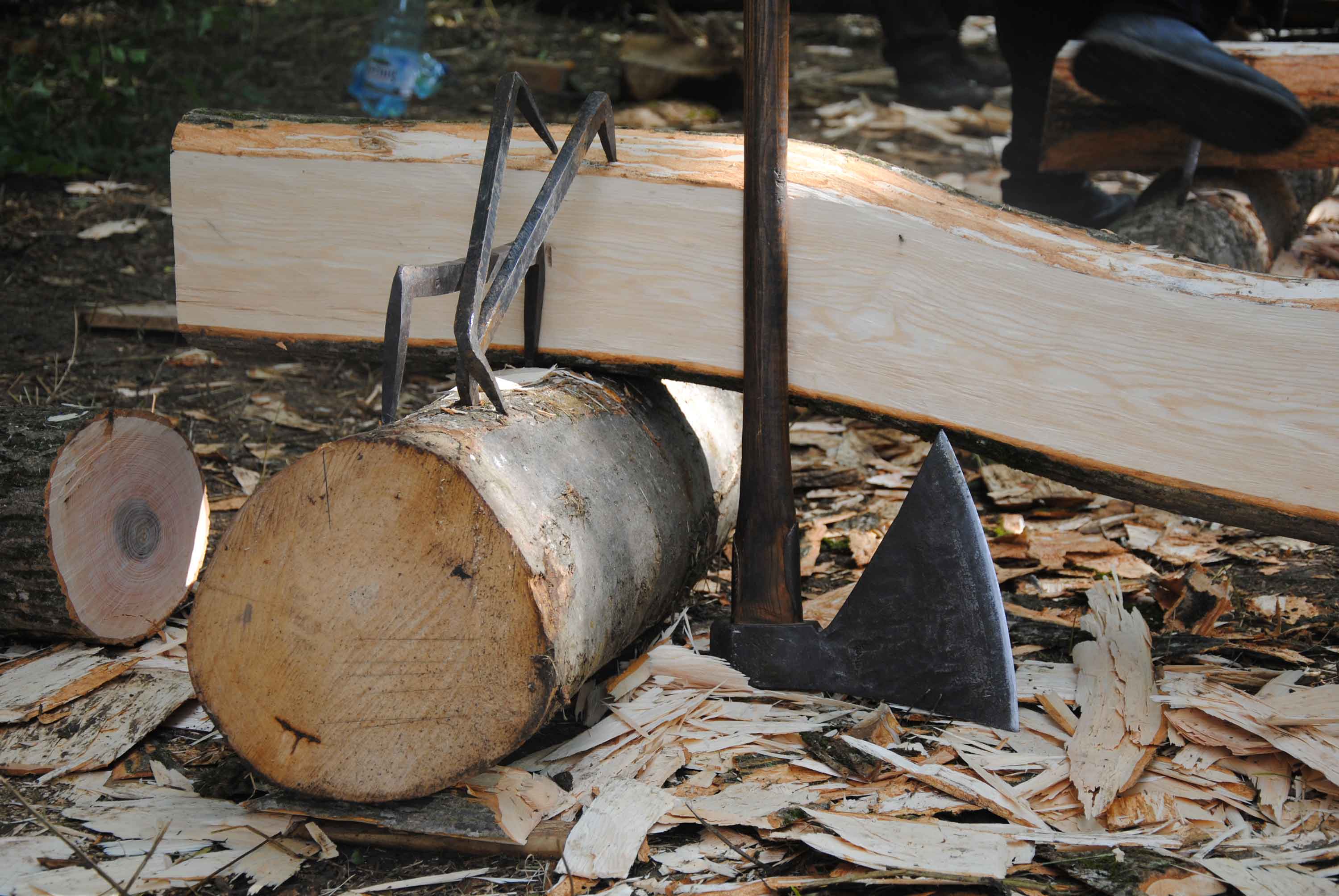 During this meeting, he demonstrated his method of squaring up a beam of oak using the characteristic tools of his region of origin. He started by felling a tree with axe and saw. He then began to hew with the bradvil, a symmetrically bevelled axe with a straight handle. The finishing stages were done with his asymmetrically bevelled ‘stranak’ axe, with its offset, bent handle.