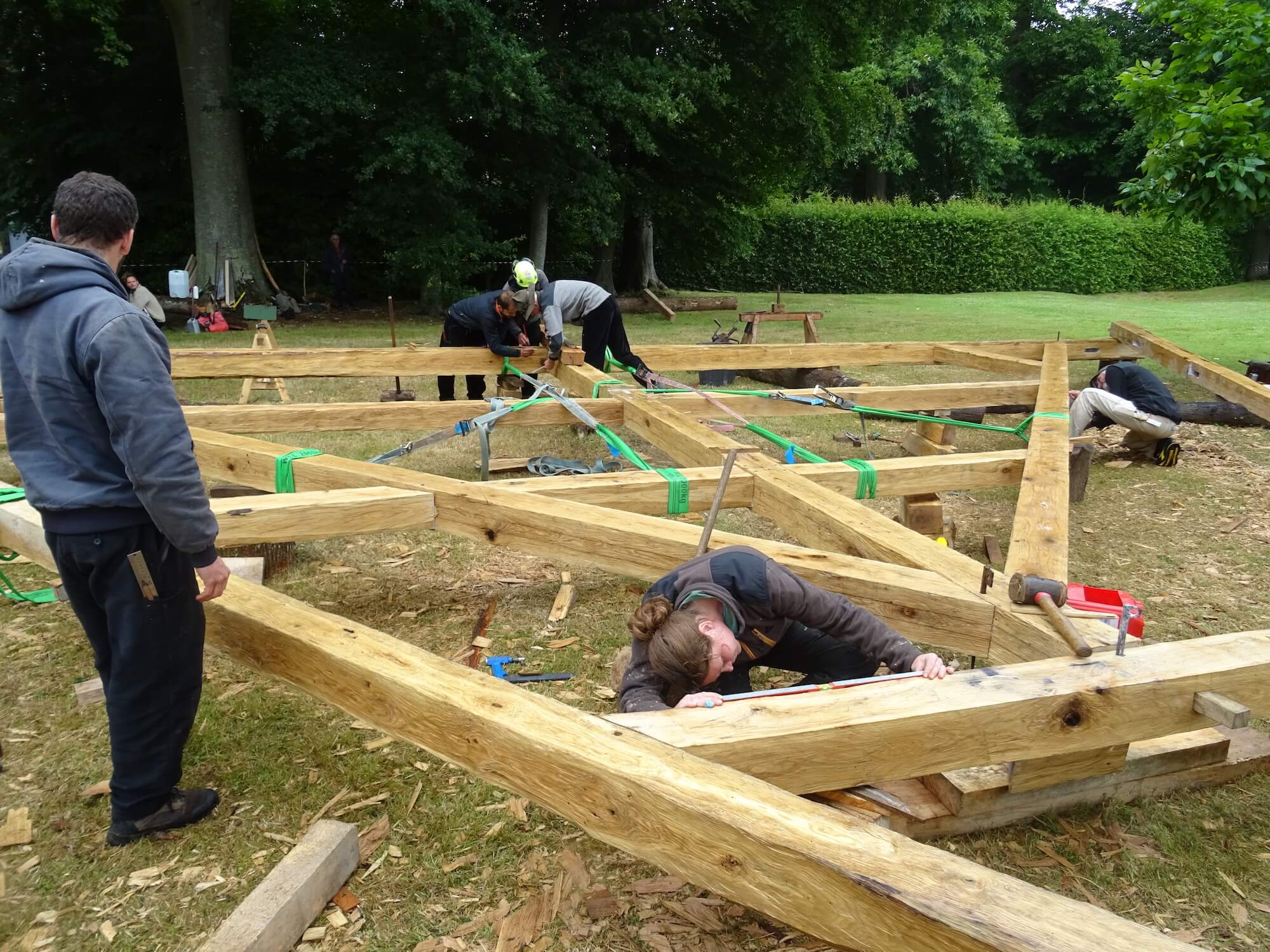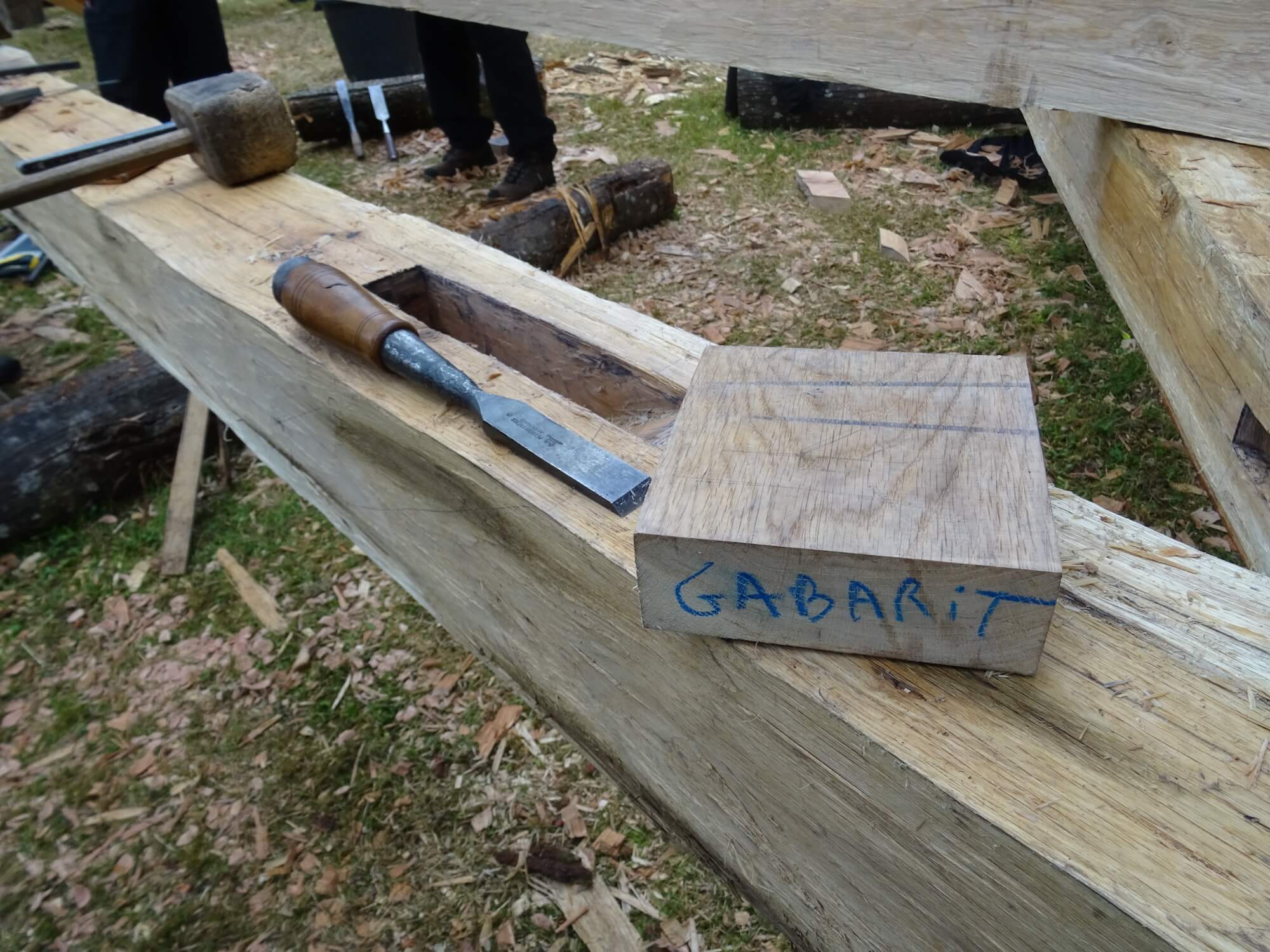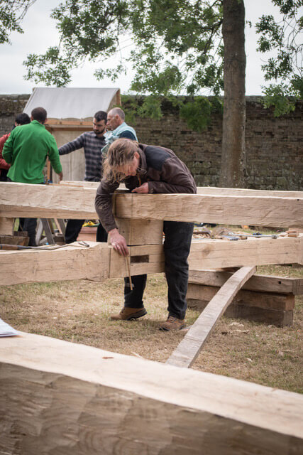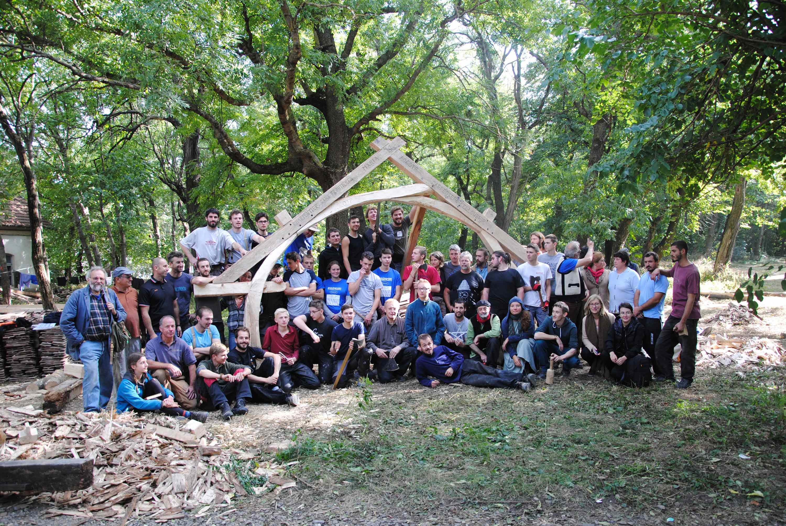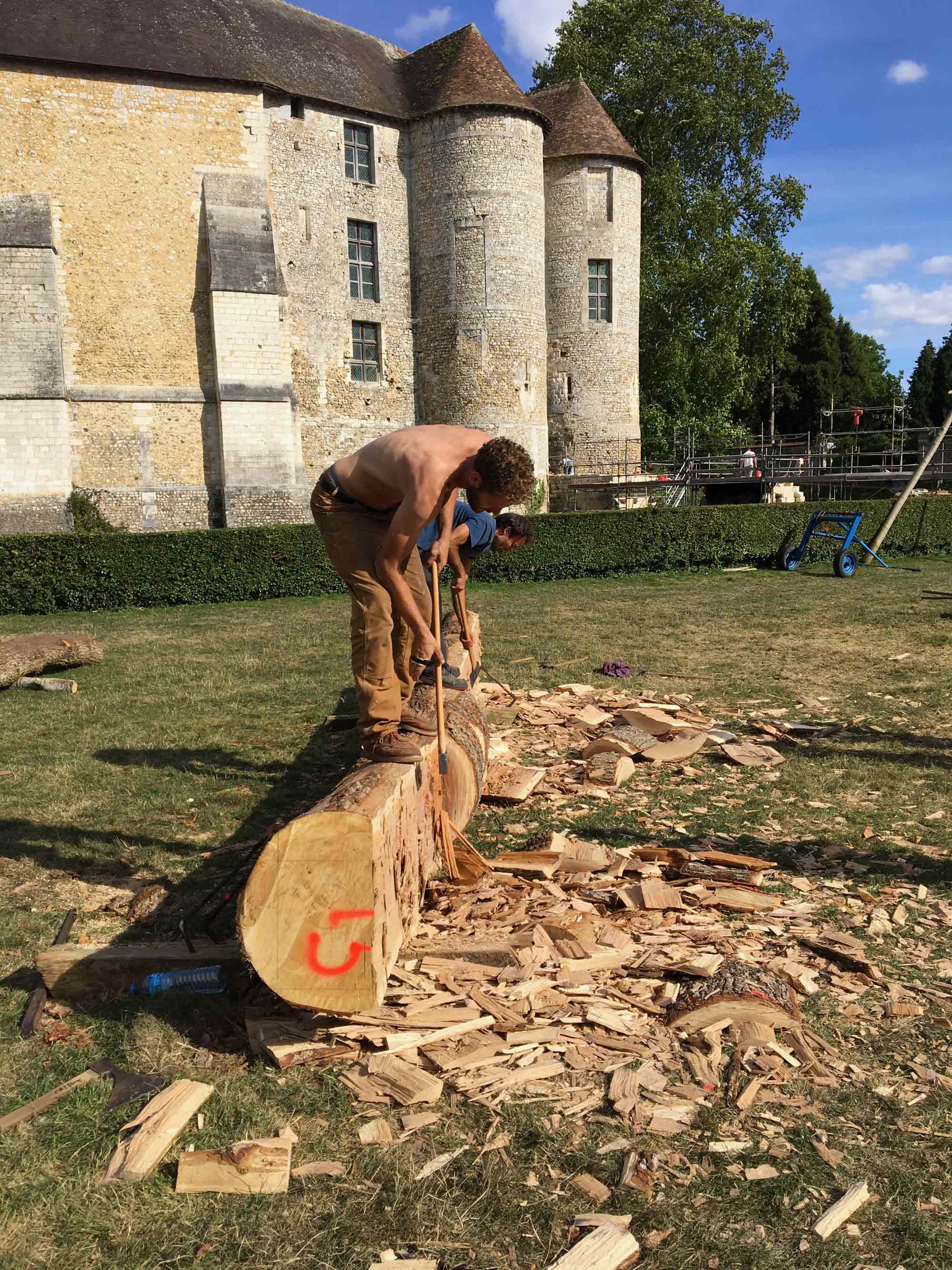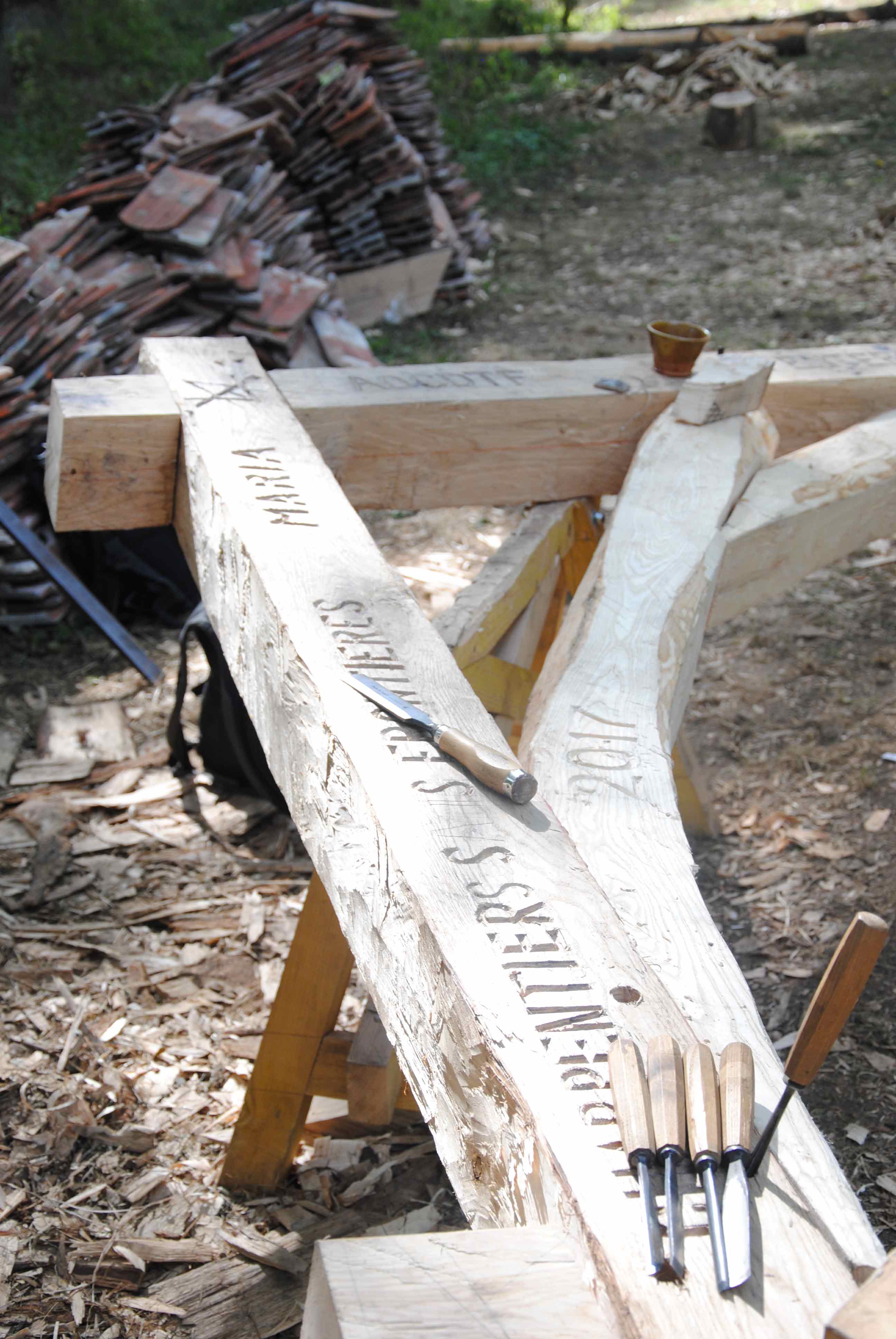 This gathering took place thanks to the participation of a significant number of German and Czech carpenters as well as many others from Britain, Canada and France. The project was overseen by the German Compagnon carpenter Axel Weller. An important part of the project was the participation of a group of apprentice carpenters from the nearby professional training college of CEREF BTP Bourgtheroulde under their instructor supervisor Eric Lion. Following their initiation into the techniques of manual carpentry, one of the apprentices took up several years of further apprenticeship with Axel.