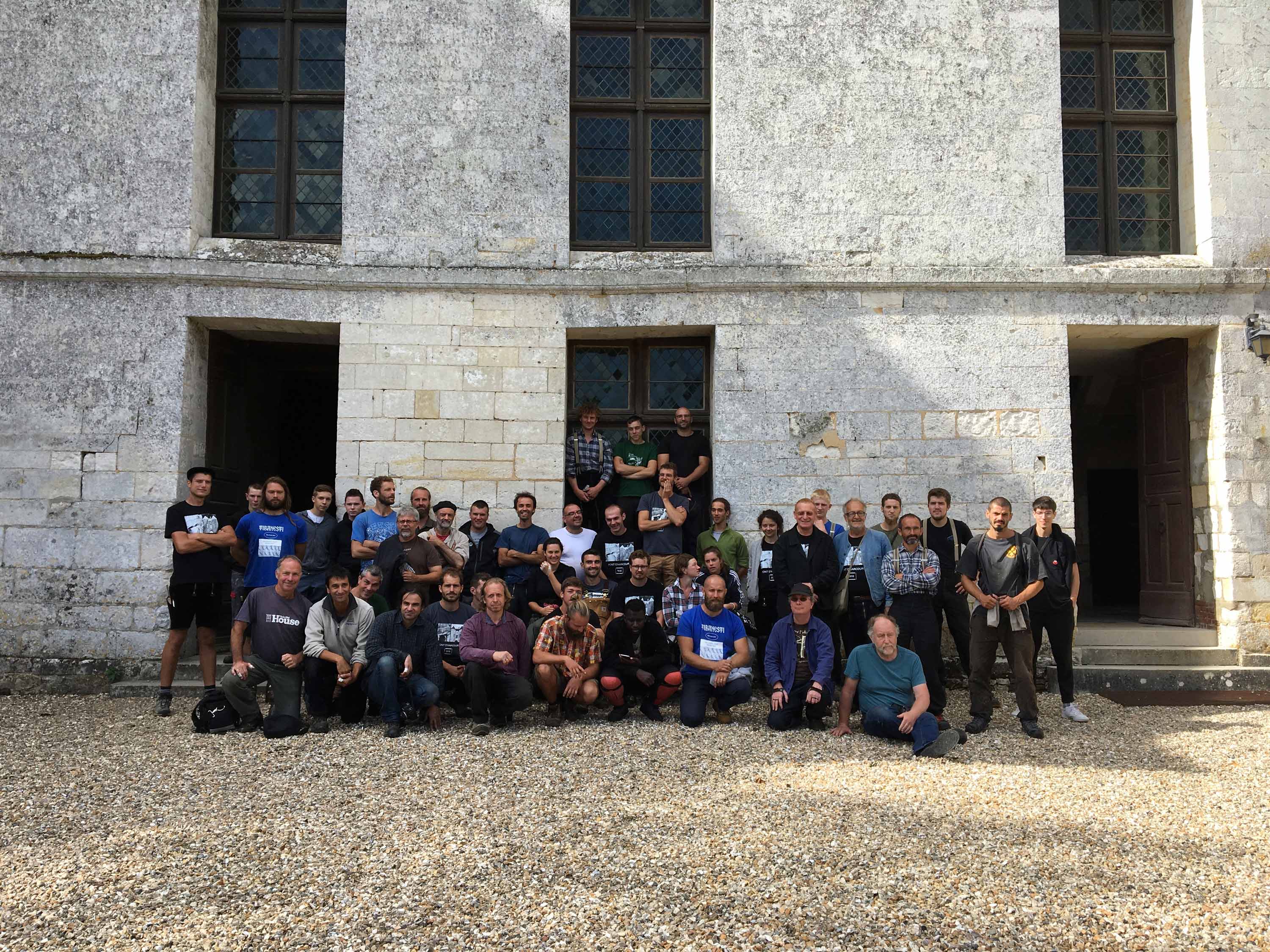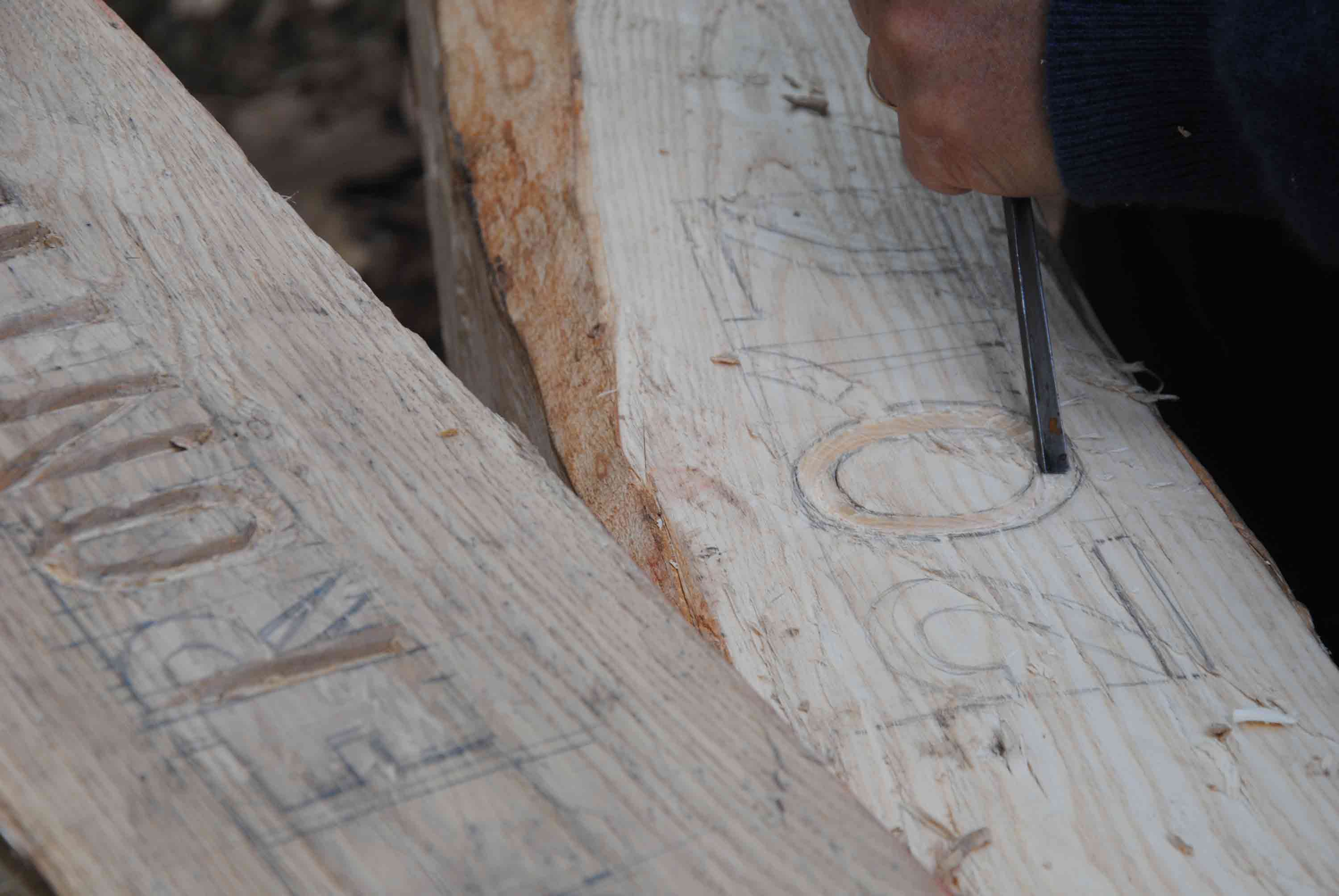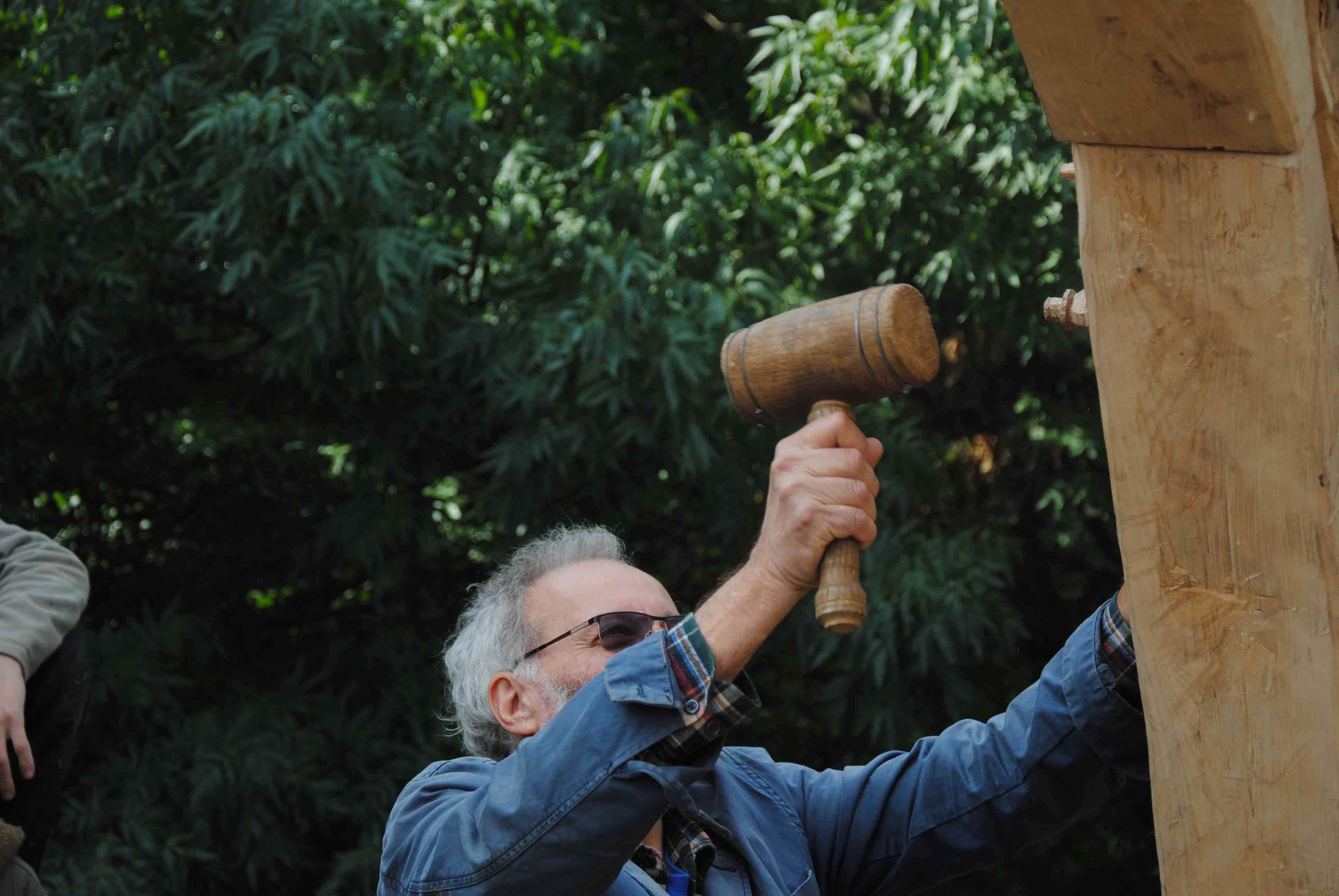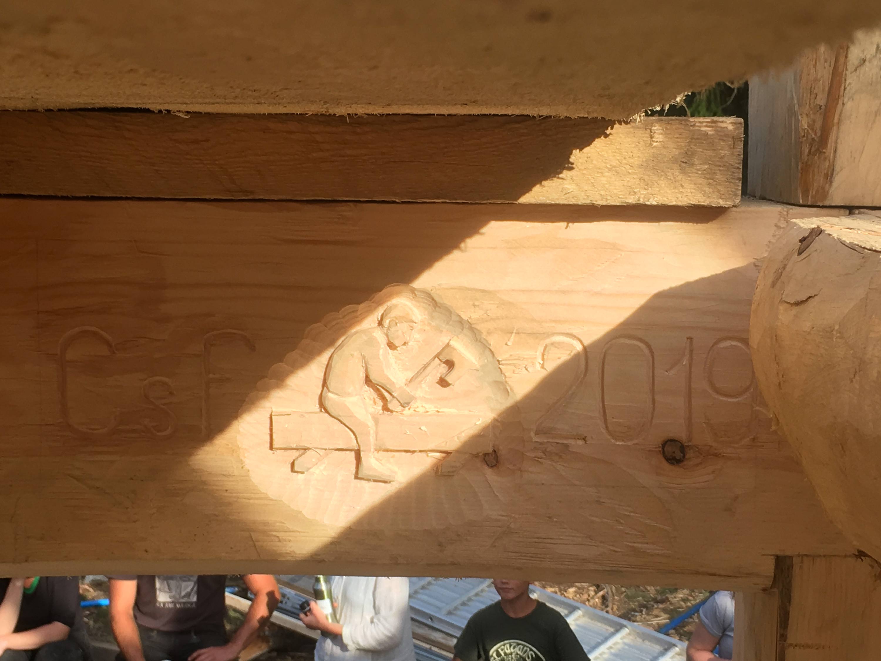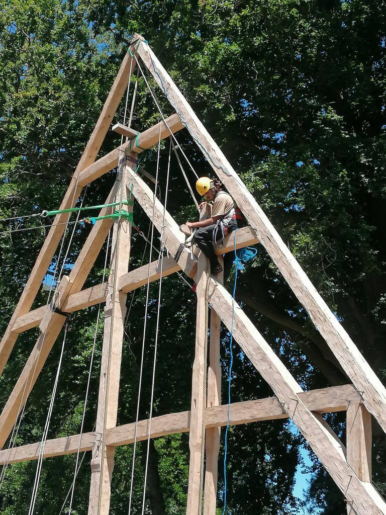 This gathering took place thanks to the participation of a significant number of German and Czech carpenters as well as many others from Britain, Canada and France. The project was overseen by the German Compagnon carpenter Axel Weller. An important part of the project was the participation of a group of apprentice carpenters from the nearby professional training college of CEREF BTP Bourgtheroulde under their instructor supervisor Eric Lion. Following their initiation into the techniques of manual carpentry, one of the apprentices took up several years of further apprenticeship with Axel.