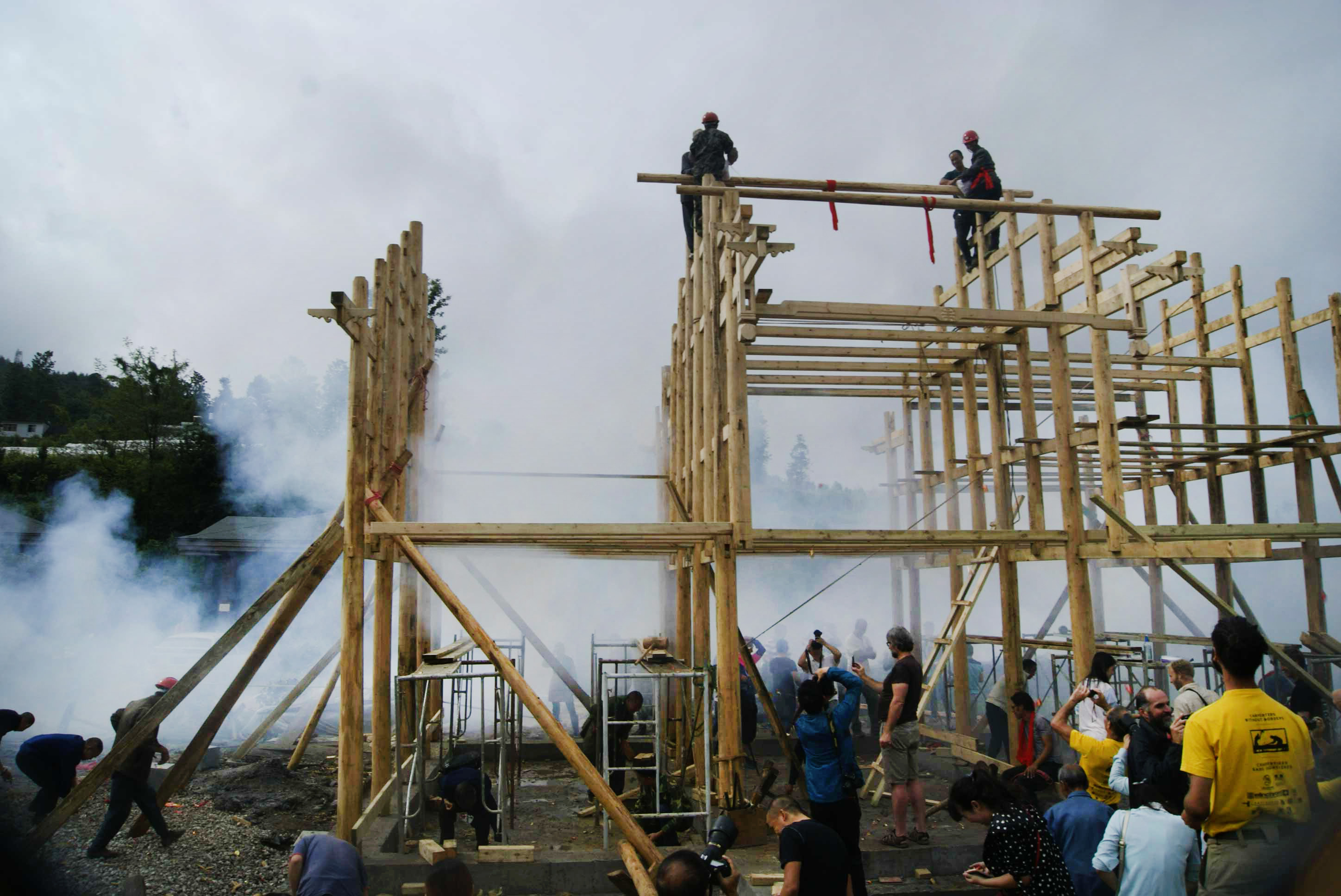 Les bénévoles de Charpentiers sans frontières en lien avec la fondation Ruan Yisan de Shanghai se rendent dans la province du GuiZhou en Chine, région de moyenne montagne. Durant deux semaines se déroule un chantier de grande ampleur avec une équipe composée de Chinois et d’Européens, par delà les barrières linguistiques. L’objectif est la construction en commun d’un bâtiment de 60 m² au sol doté d’une charpente pourvue d’une structure anti-sismique. Ce bâtiment est conçu selon les plans séculaires de l’architecture rurale locale. La structure se compose de poteaux verticaux de bois résineux, dans lesquels viennent se mortaiser de longues traverses horizontales. Cet ensemble est à la fois stable et souple, de manière à pouvoir reprendre sa place originelle après une secousse de tremblement de terre. Le bois utilisé, appelé "shan mu", est un résineux très tendre proche du sapin de pays. Il est utilisé dans toute sa section ronde et façonné au rabot à deux poignées.