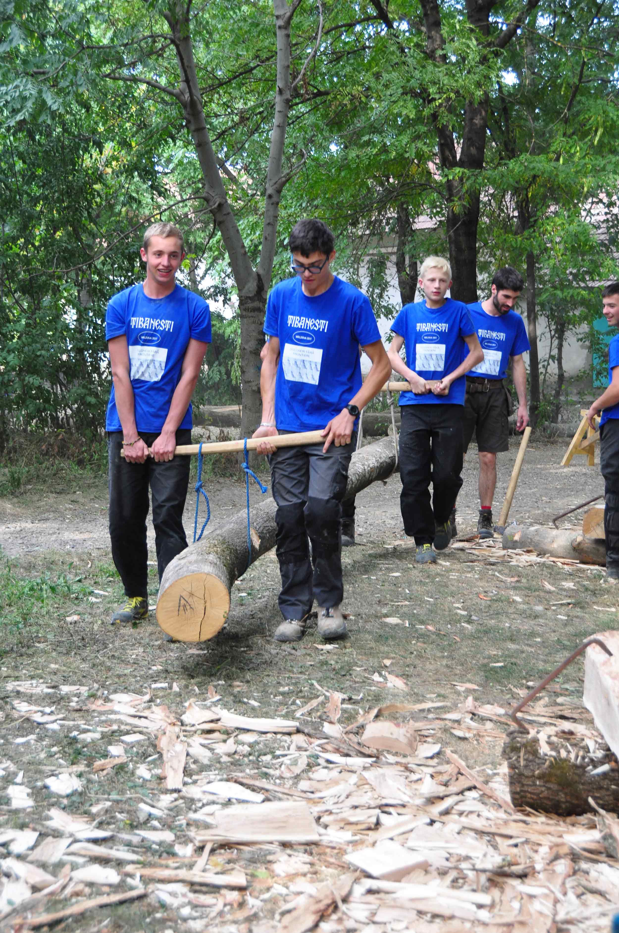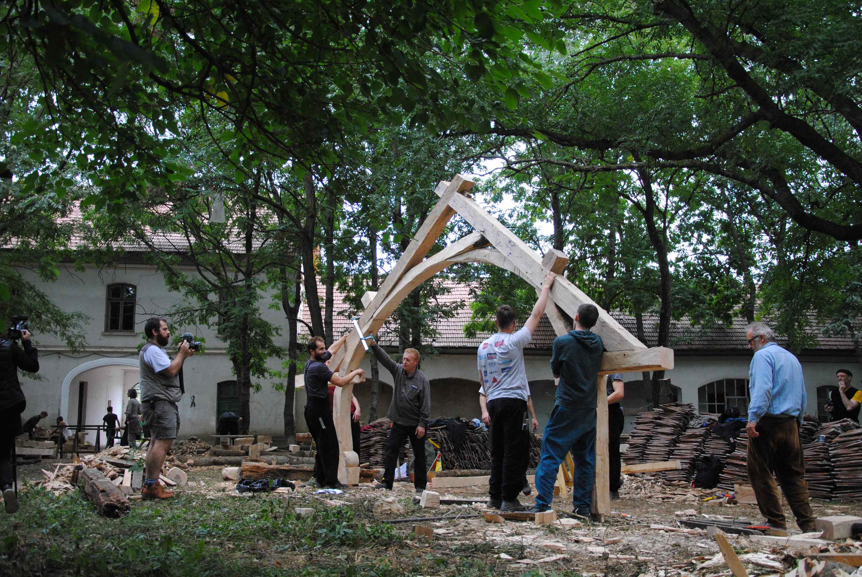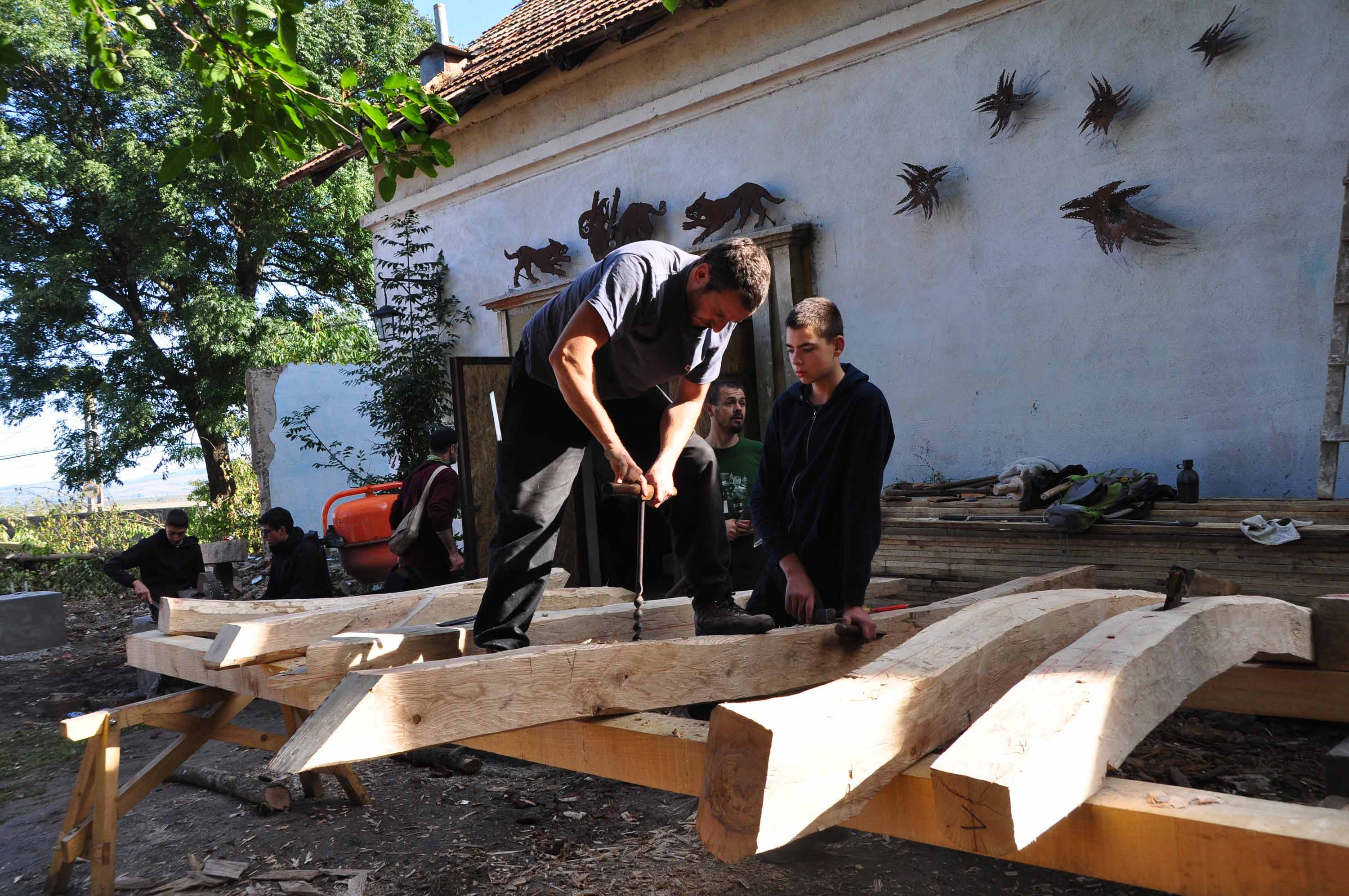 Le Konak Petre P. Carp est un ancien manoir entouré d’un domaine boisé, dont le propriétaire actuel Șerban Sturdza veut tranformer l’usage, pour le bien commun d’une région très affectée par la crise sociale et économique. Ainsi la fondation Maria, assistée de Pro Patrimonio, œuvre depuis la chute de la dictature pour restaurer cet ensemble patrimonial et y accomplir de nombreux projets en faveur des arts, de l’action sociale, des savoir-faire et du patrimoine. CsF s’associe aux Compagnons charpentiers du Devoir pour effectuer, sous la direction de Șerban Sturdza, Yoann Gabouty et François Calame, la reconstruction du comble du bâtiment de forge de la propriété, actuellement dévolu à un centre de formation aux métiers du fer. De nombreux frênes sont choisis et abattus dans les bois avoisinants. Les arbres choisis présentent des formes cintrées pour permettre de s’inscrire dans le projet d’un comble à arbalétriers et jambe de force courbes. Ce nouveau comble utilisable sera affecté à des salles de cours au profit des élèves de la commune de Ţibăneşti.