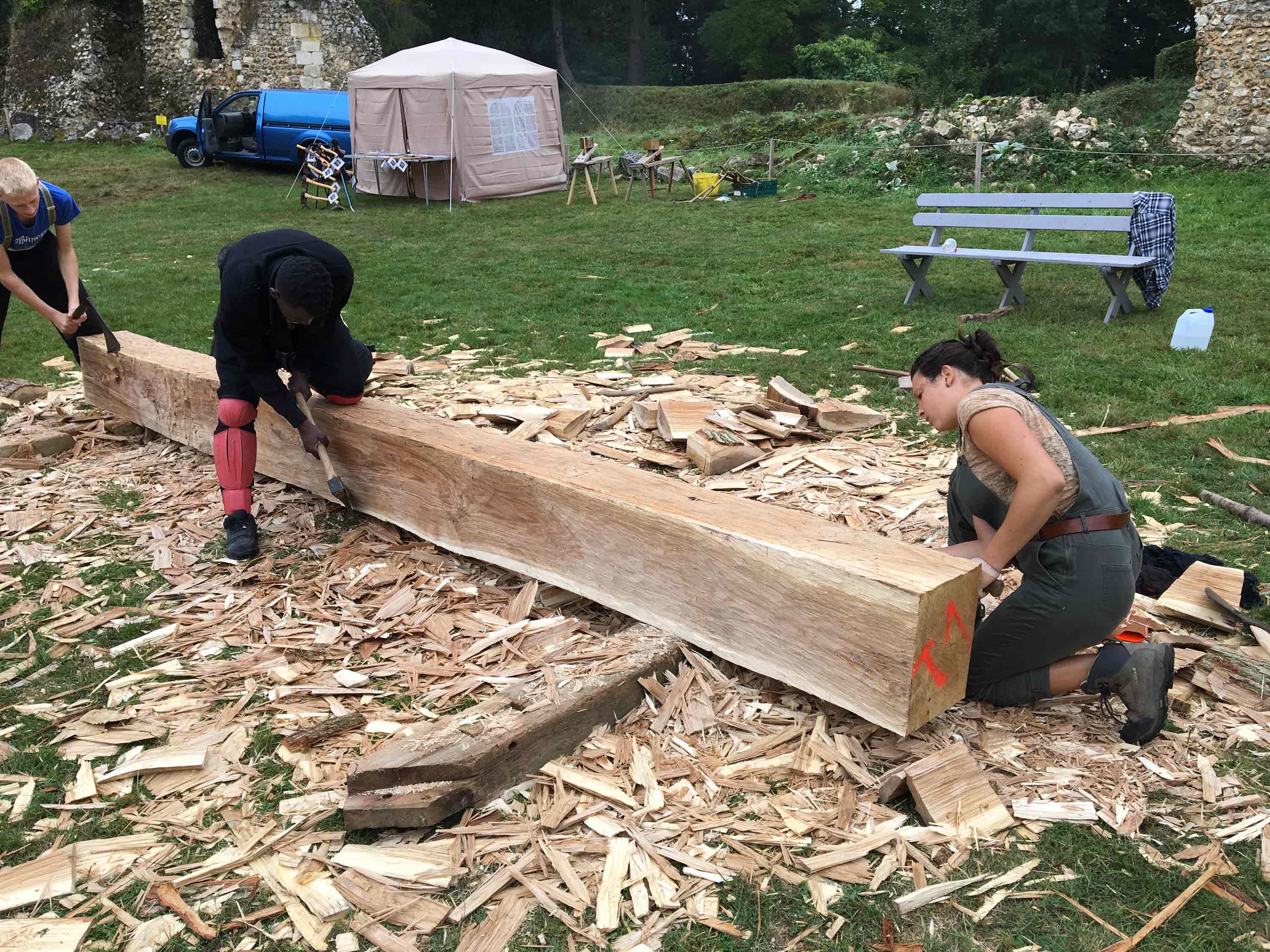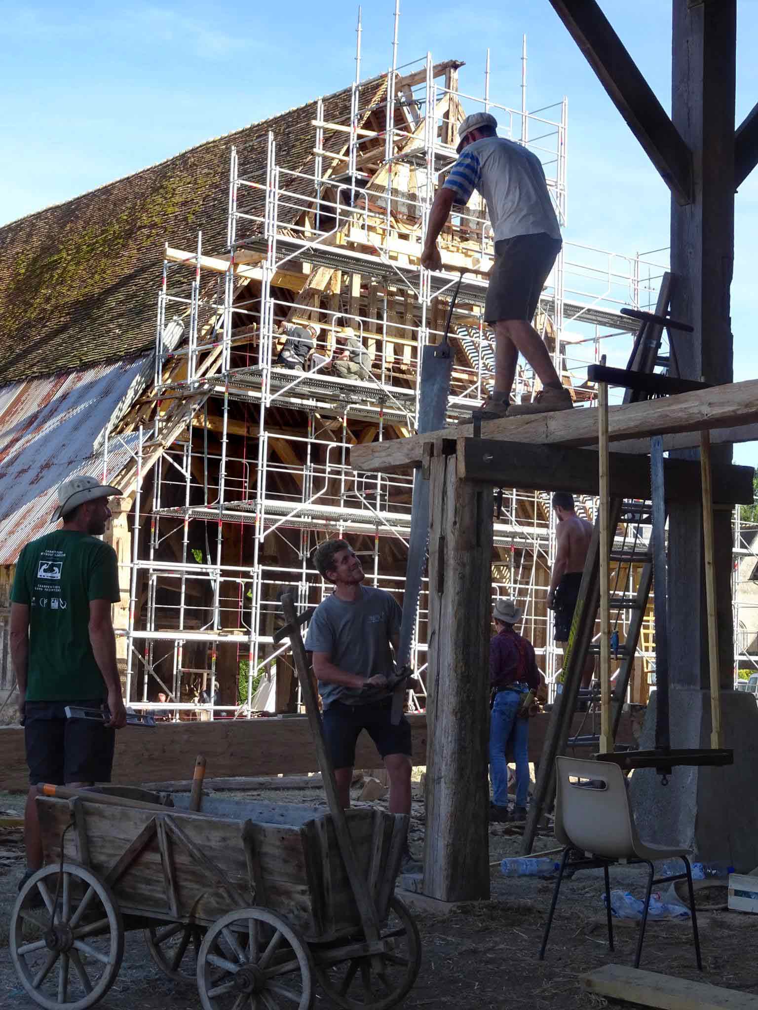 Ces chantiers sont menés grâce à la participation d’importantes équipes allemandes et tchèques associées à des Britanniques, Canadiens, Français sous la conduite du compagnon charpentier saxon Axel Weller (Allemagne). Une équipe d’apprentis français du CEREF BTP conduite par Eric Lion participe au chantier afin de s’initier aux techniques pré-industrielles. L’un de ces apprentis a poursuivi ensuite pendant plusieurs années sa formation avec Axel. Le chantier met en œuvre deux types de façonnage des chênes de provenance locale. D’une part par équarrissage selon la méthode allemande avec la Breitbeil (hache à large taillant et manche court), et d’autre part par sciage de long sur de nombreuses pièces de colombage. Deux pignons de colombage de bâtiments agricoles de la ferme du château de Mesnil-Geoffroy sont ainsi entièrement recréés en attendant le garnissage en torchis.