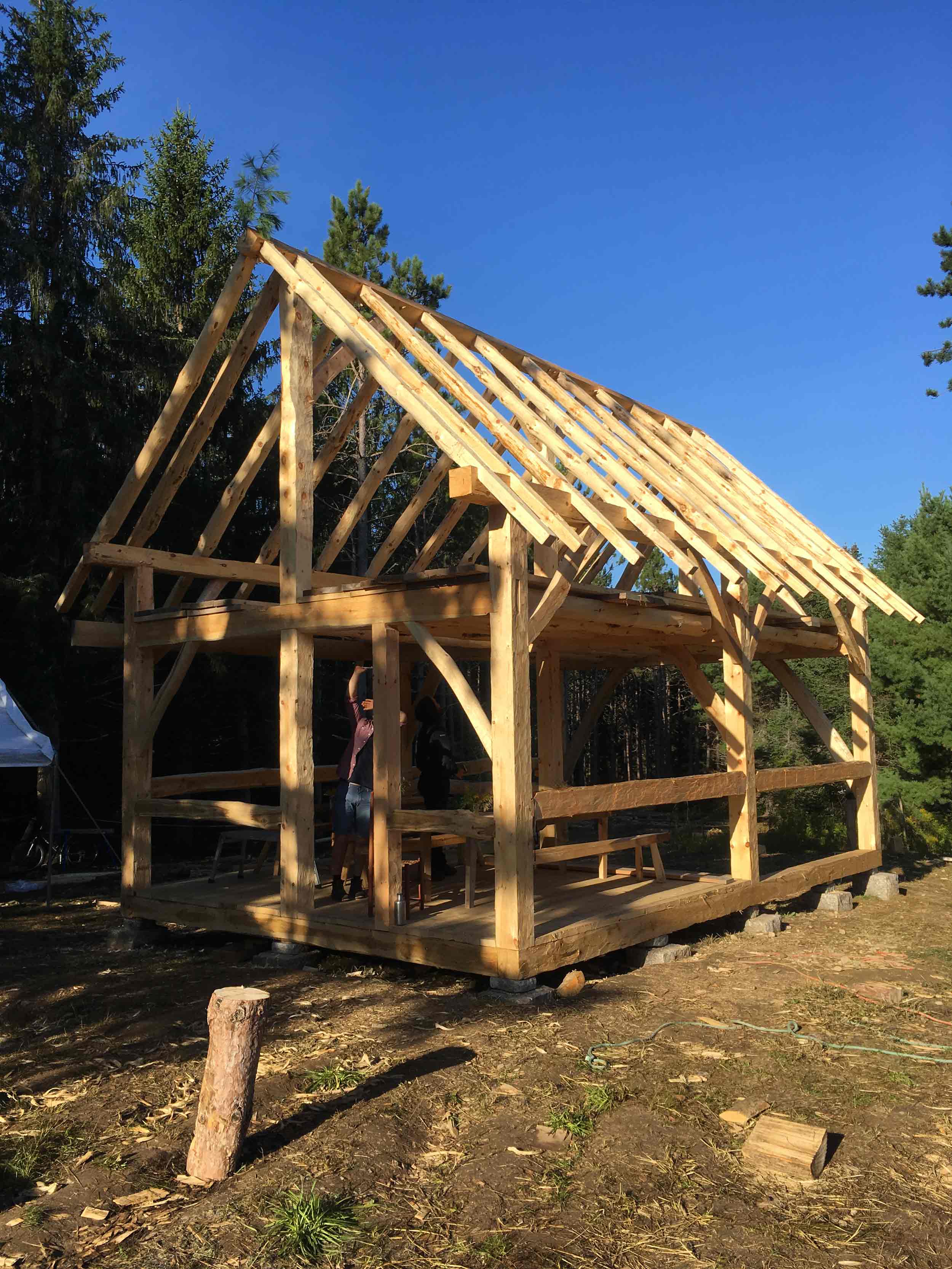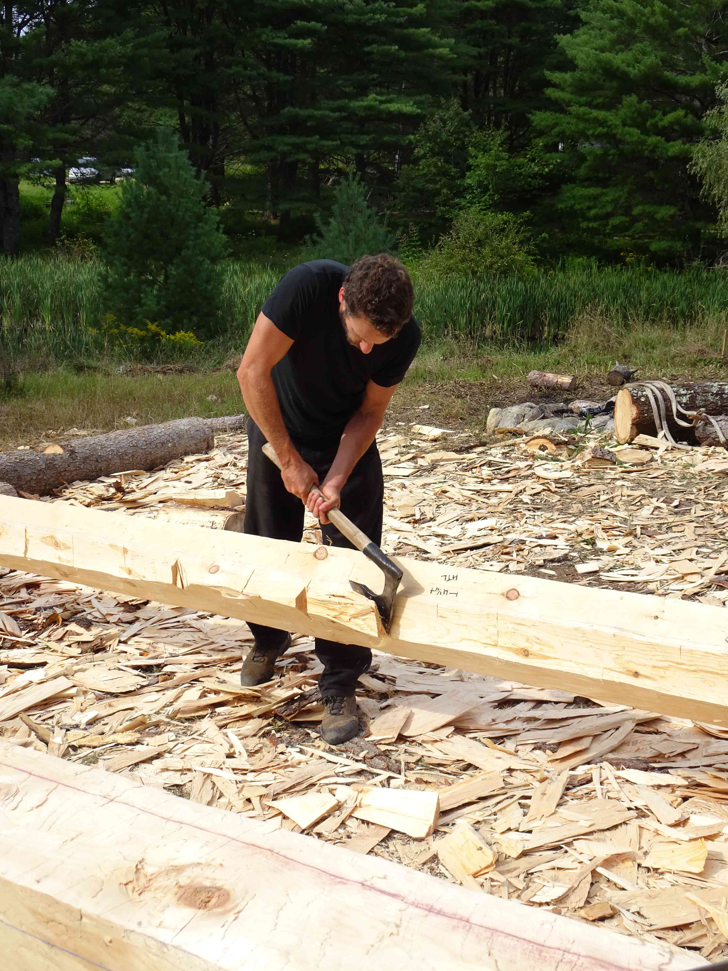 In advance of our arrival, Joshua and a local horse-logger woodsman, had felled several dozen trees of Eastern white pine, maple and cherry from the surrounding forest and hauled them to the site. The foundation of substantial granite blocks sourced from a nearby quarry was also already prepared and set in place.
