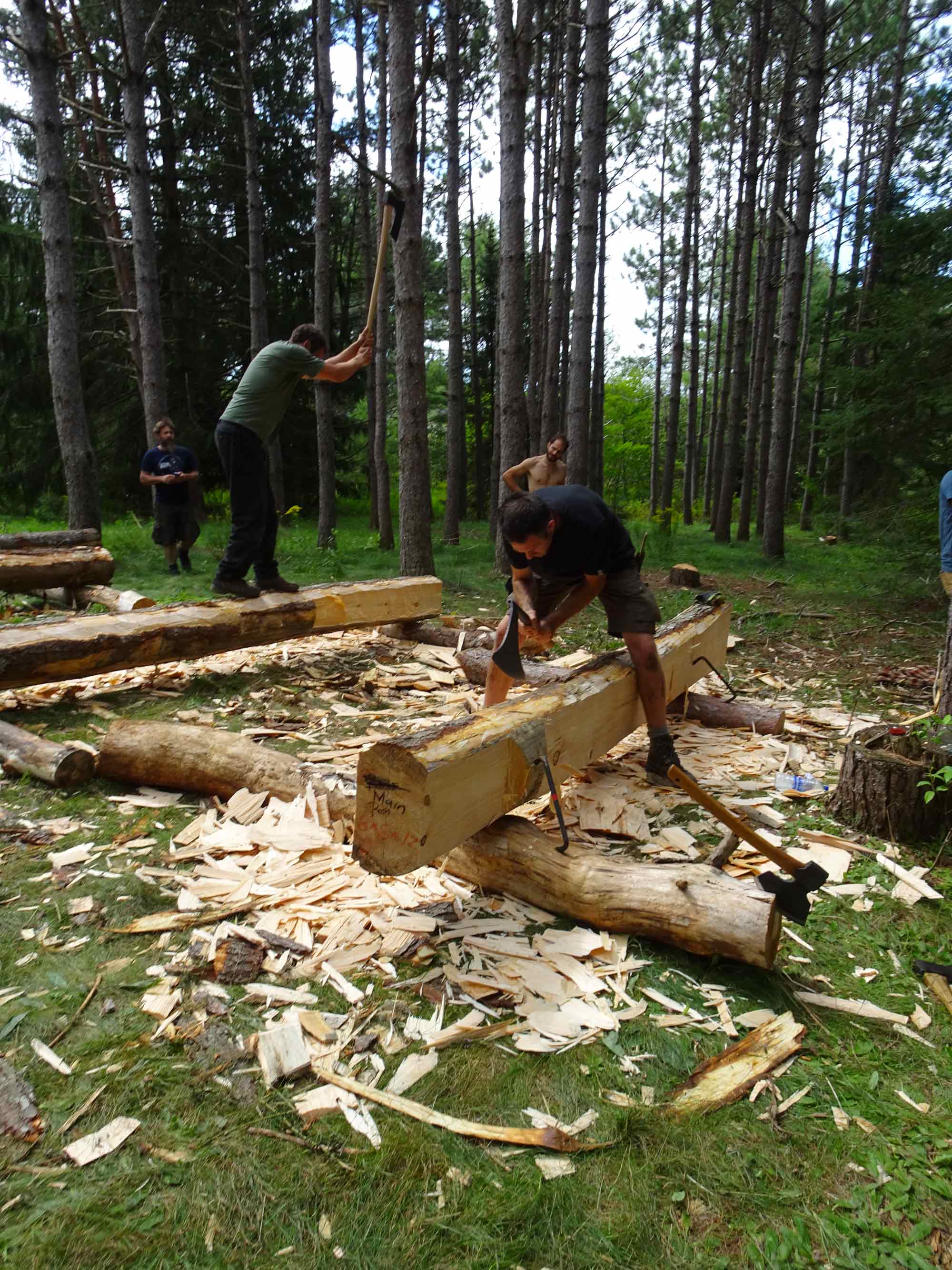 À l’invitation de Joshua Klein et son équipe de Mortise & Tenon Magazine, une équipe de Charpentiers sans Frontières se rend aux Etats Unis, dans le Maine (Nouvelle-Angleterre). Durant quinze jours, l’équipe internationale s’attelle à la construction intégrale d’un bâtiment de forge en bois qui faisait défaut aux installations, chaleureuses mais assez élémentaires, du centre de formation de Sedgwick. Les préparatifs préliminaires ont permis de préparer les fondations sommaires sur blocs de granit, de choisir et d’abattre plusieurs dizaines de Eastern white pine, d’érables et de merisiers, destinés à être équarris par notre équipe américano-européenne. Les charpentiers étrangers sur ce chantier sont venus de France, Grande-Bretagne, Espagne, Estonie, Finlande et Nouvelle-Zélande.
