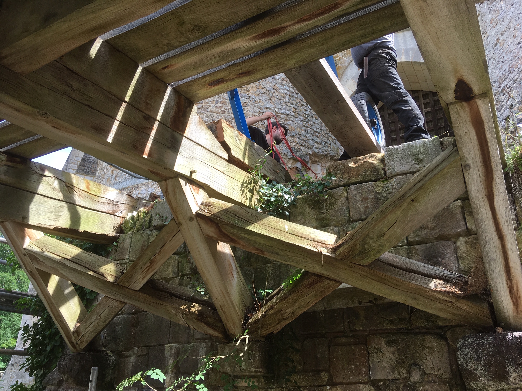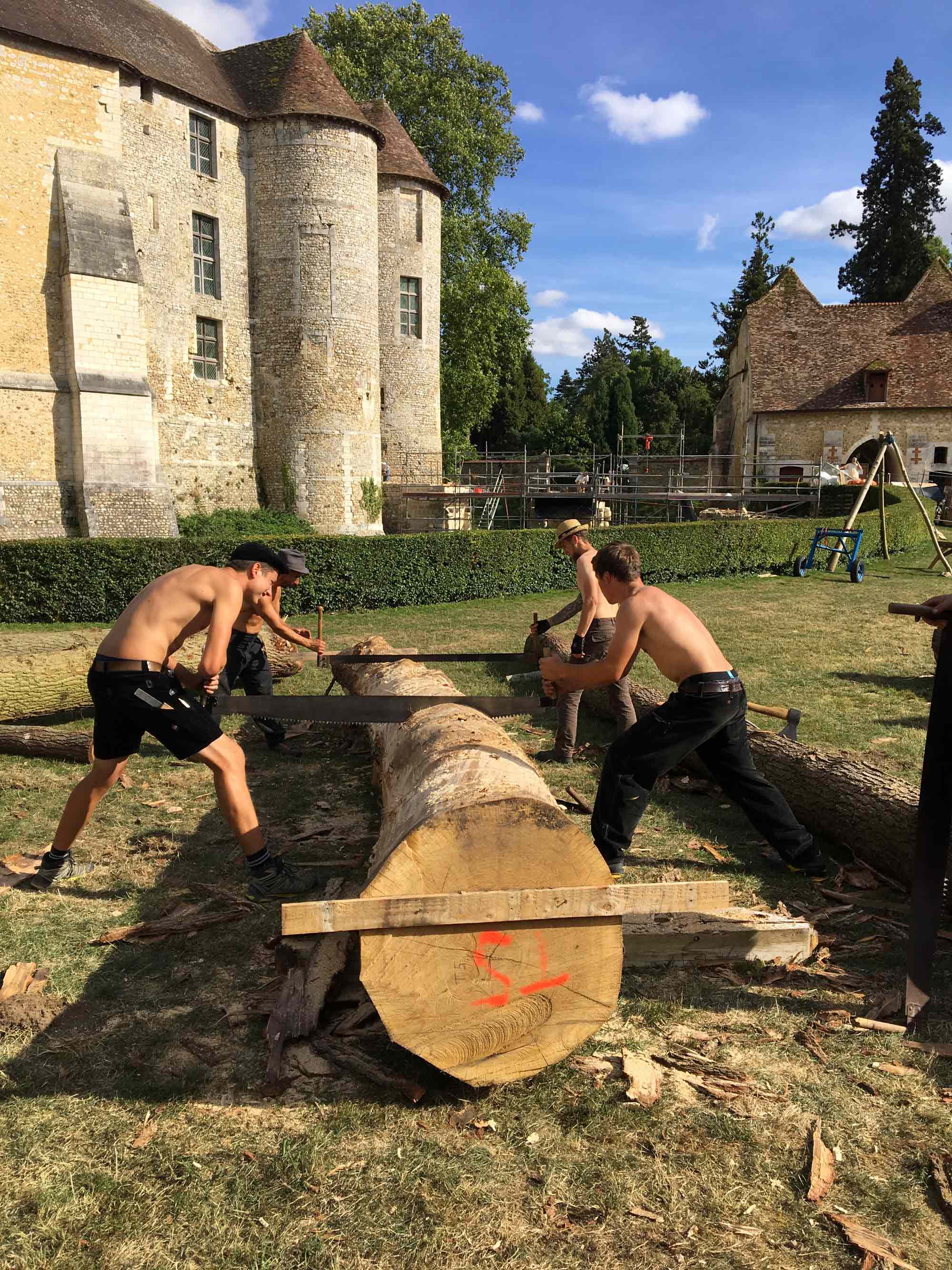 Le chantier a pour objet la reconstruction à neuf de l’ancien pont-levis du château médiéval. Devenu un pont dormant c’est à dire fixe, ce passage entre les parties nobles de l’édifice et la basse-cour n’était plus fonctionnel depuis 1998. Nous décidons de le reconstruire en charpente, en utilisant au maximum les bois locaux, et notamment les chênes du parc, présents en grand nombre à proximité du château. CsF procède donc à l’abattage manuel de quinze chênes en janvier 2018. Le complément d’arbres est trouvé dans d’autres forêts de l’Eure. L’usage du pont prévu pour le grand public impose la collaboration avec un bureau d’ingénierie destiné à vérifier le respect des normes de sécurité et de longévité de la structure. Un certain nombre de discussions et mises au point ont permis de rendre compatibles les techniques traditionnelles de charpente, privilégiées par l’équipe de CsF, avec les exigences et normes sécuritaires spécifiques au site.
