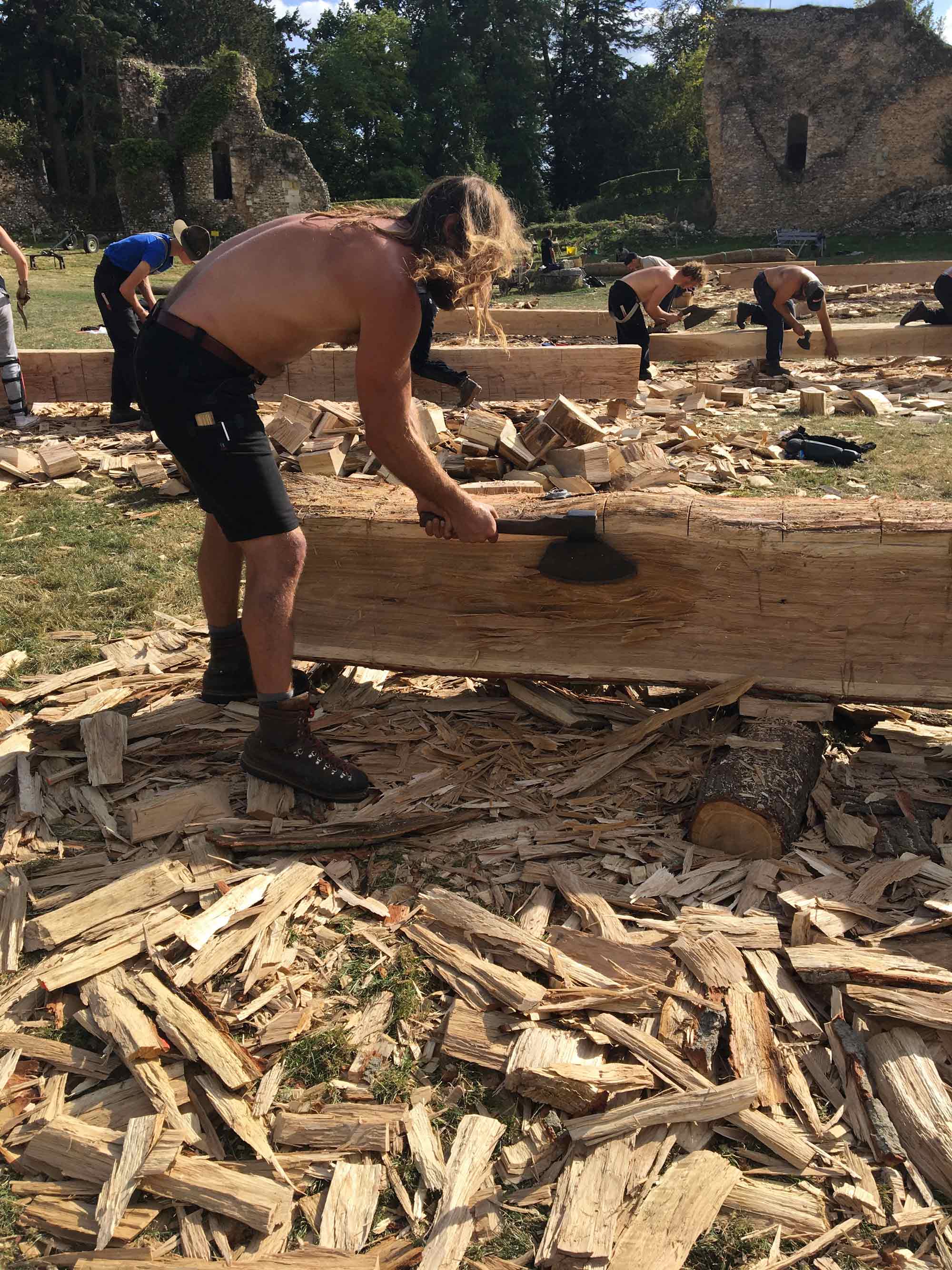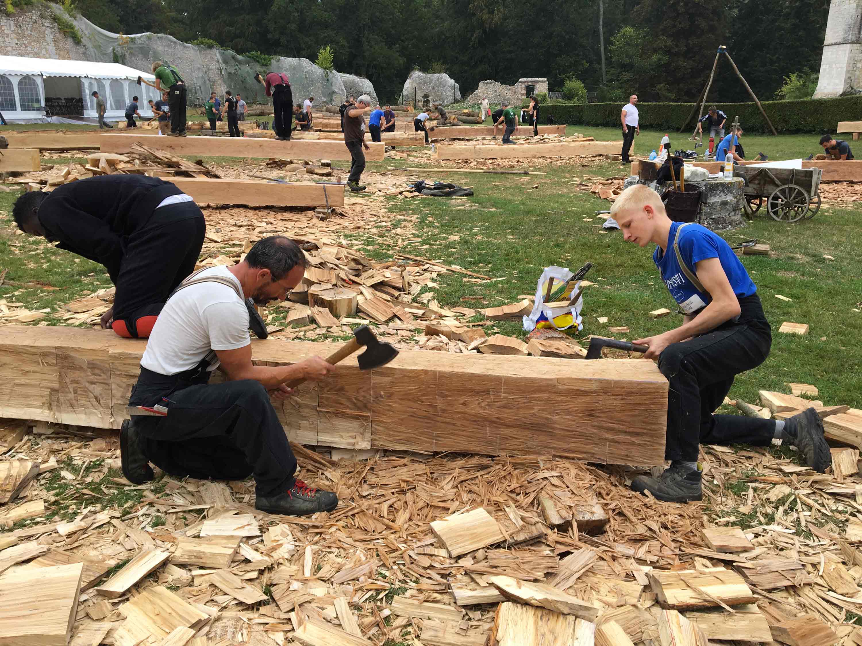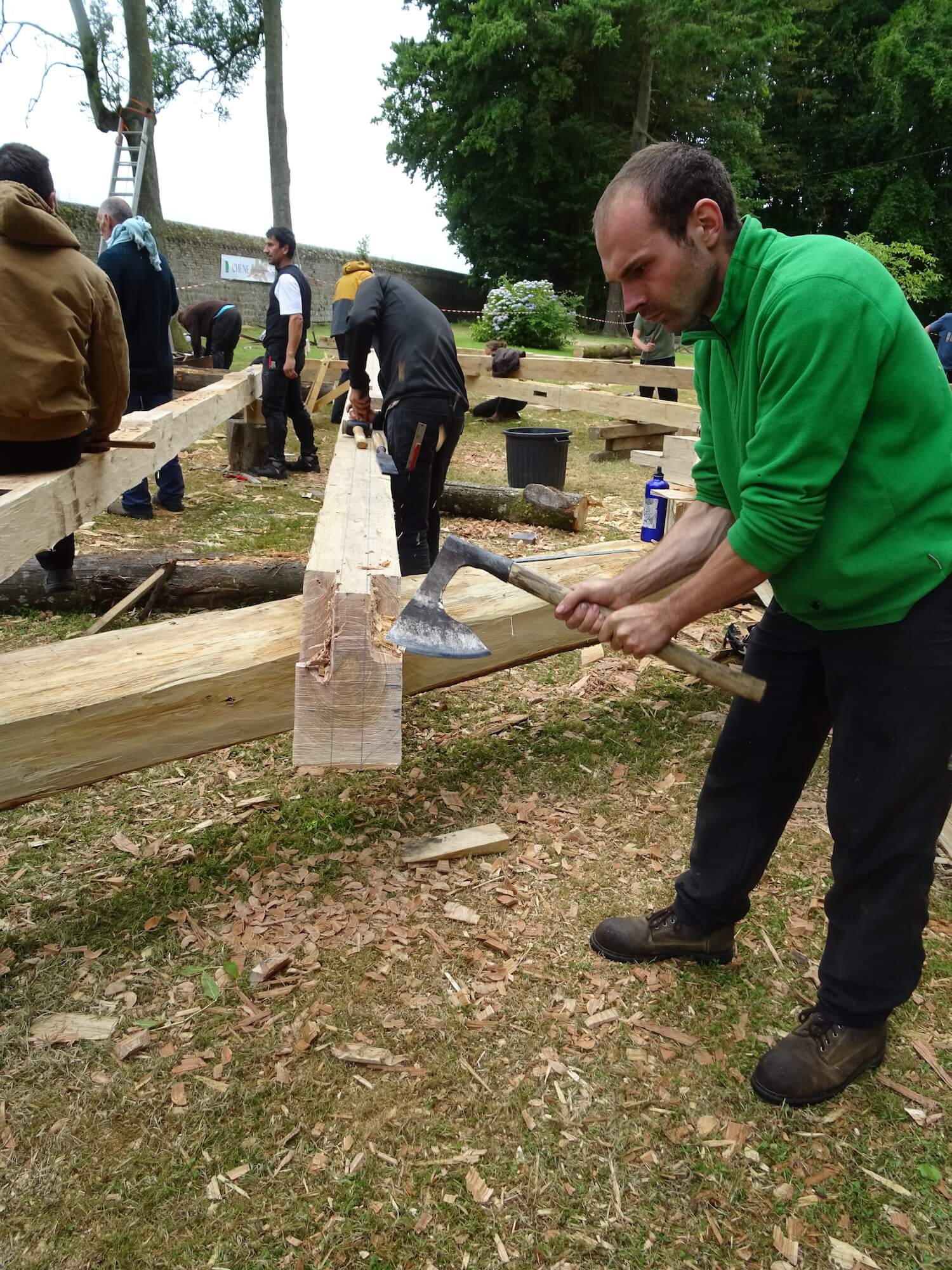 Une équipe internationale venant de Grande-Bretagne, Pologne, Lituanie, Turquie, Suède, France et Roumanie, réalise le premier chantier à la hache en Normandie dans une ferme fortifiée, Monument Historique. Durant une semaine, les équipes échangent et mettent en valeur les savoirs spécifiques à chaque pays. Par exemple, l’équipe française très compétente pour les tracés géométriques (trait) a tout à apprendre des techniques d’équarrissage et de taille à la main. La restauration des pans de bois (murs en colombage) concerne plusieurs granges et bâtiments d’élevage sauvés ainsi de la destruction. Un hangar sur quatre poteaux équarris à la hache par les charpentiers du Maramureș (Roumanie) est recréé pour protéger l’emplacement du puits de la ferme seigneuriale.