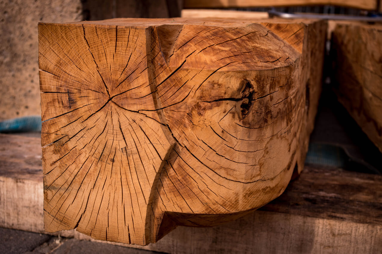 Our task then, was to construct a new bridge across the moat, to re-establish the connection between the inner and outer courtyards of the castle. We built a fixed-frame bridge of local timber over the existing masonry pillars. The project began with the felling of fifteen oaks in January 2018 using axes and cross-cut saws from the woodlands surrounding the castle. More oaks were sourced from forests slightly further afield in the same district.