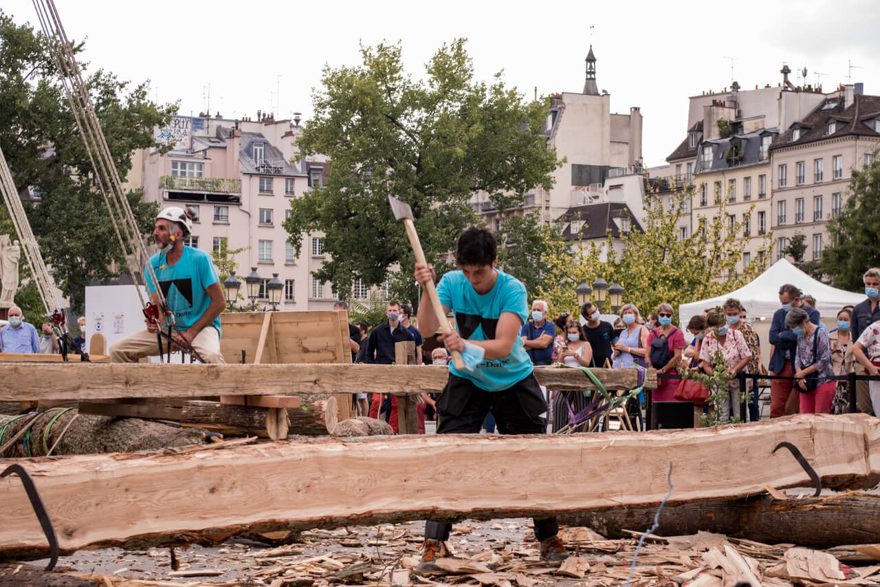 In the aftermath of the Notre-Dame fire, CsF offered its help with more than twenty years of experience in green wood handtools working. With France Bois Forêt, the national trade union for wood and forest, CsF was able to select about twenty quality oak trees for the experimental reconstruction of a gothic truss. In January 2020, the " black moon," CsF felled the trees. In July, 25 professional carpenters, men and women, cut down the 7th truss in one week, with the help of members of the british Carpenters Fellowship. Manual techniques proved their effectiveness. In view of the quality of execution and the success of this construction site, CsF repeated the demonstration of lifting the truss at the European Heritage Days on the forecourt of the cathedral, in the presence of General Georgelin and the public, head of the cathedrale reconstruction project. In December, CsF was invited to submit a technical proposal about hand tools and the green wood carpentry process for the historical monuments architects.