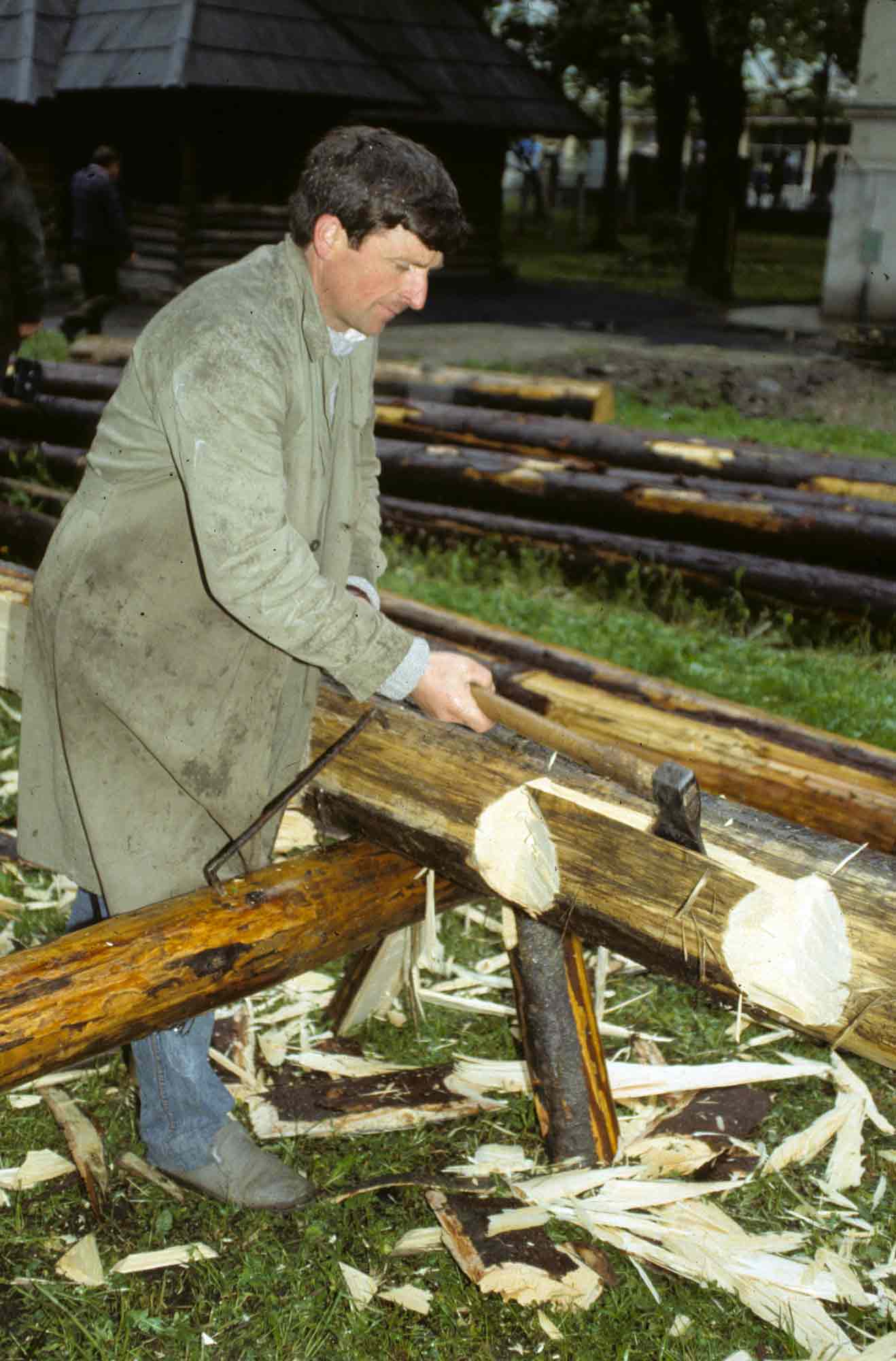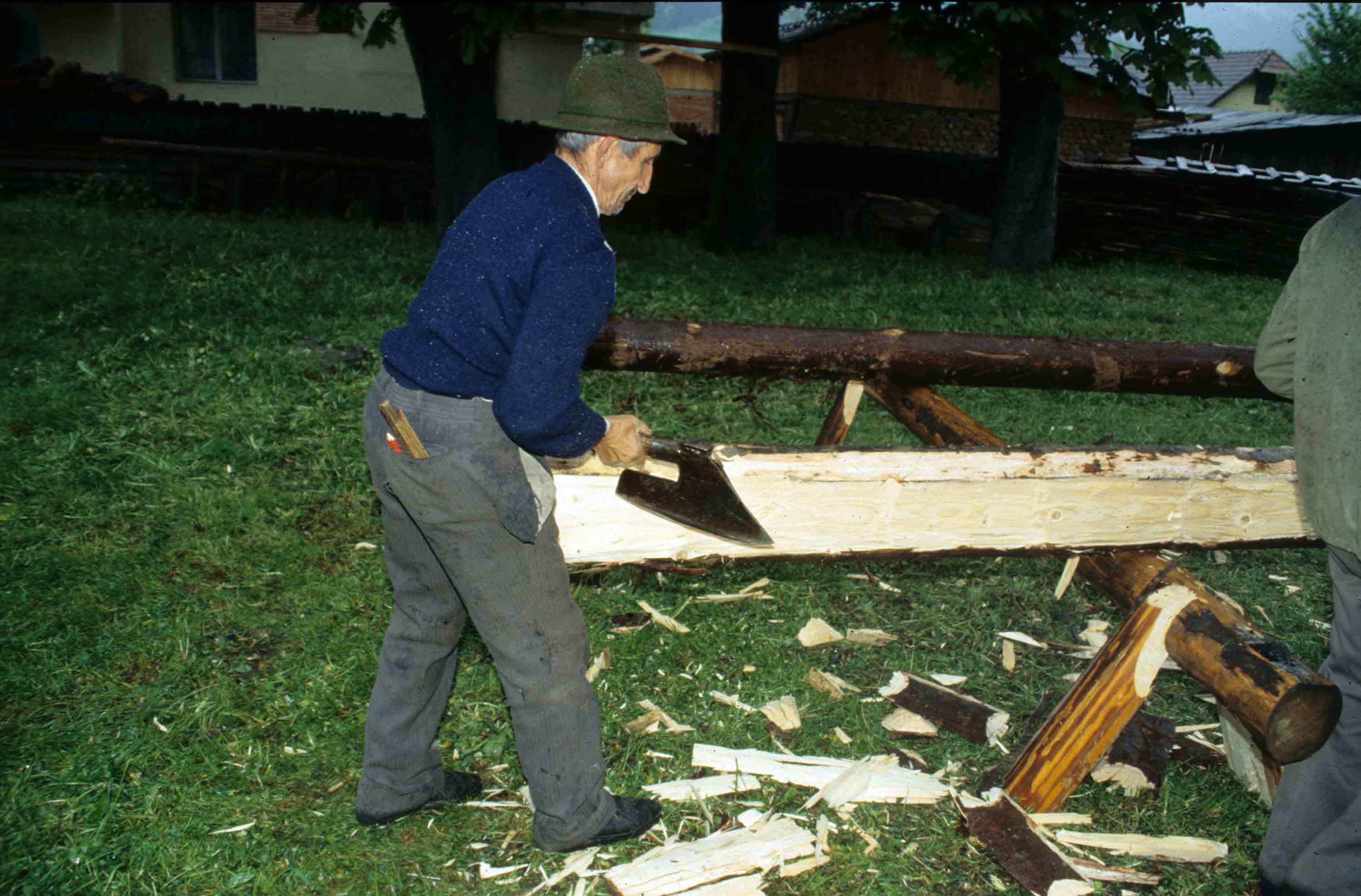 At the time of our visit, so far as we know, there was not a single French carpenter actively working with axes in the traditional manner. The Bucovinian carpenters reintroduced this working practice to the visiting team of carpenters, demonstrating the simple beauty and efficiency of the traditional practice of squaring timbers. It is not unreasonable to assert that the present resurgence of interest in traditional methods of work in carpentry, can be traced back to this gathering and the book that was published shortly after it, Charpentiers au travail, (edited by, François Calame,1993, Editions A Die).