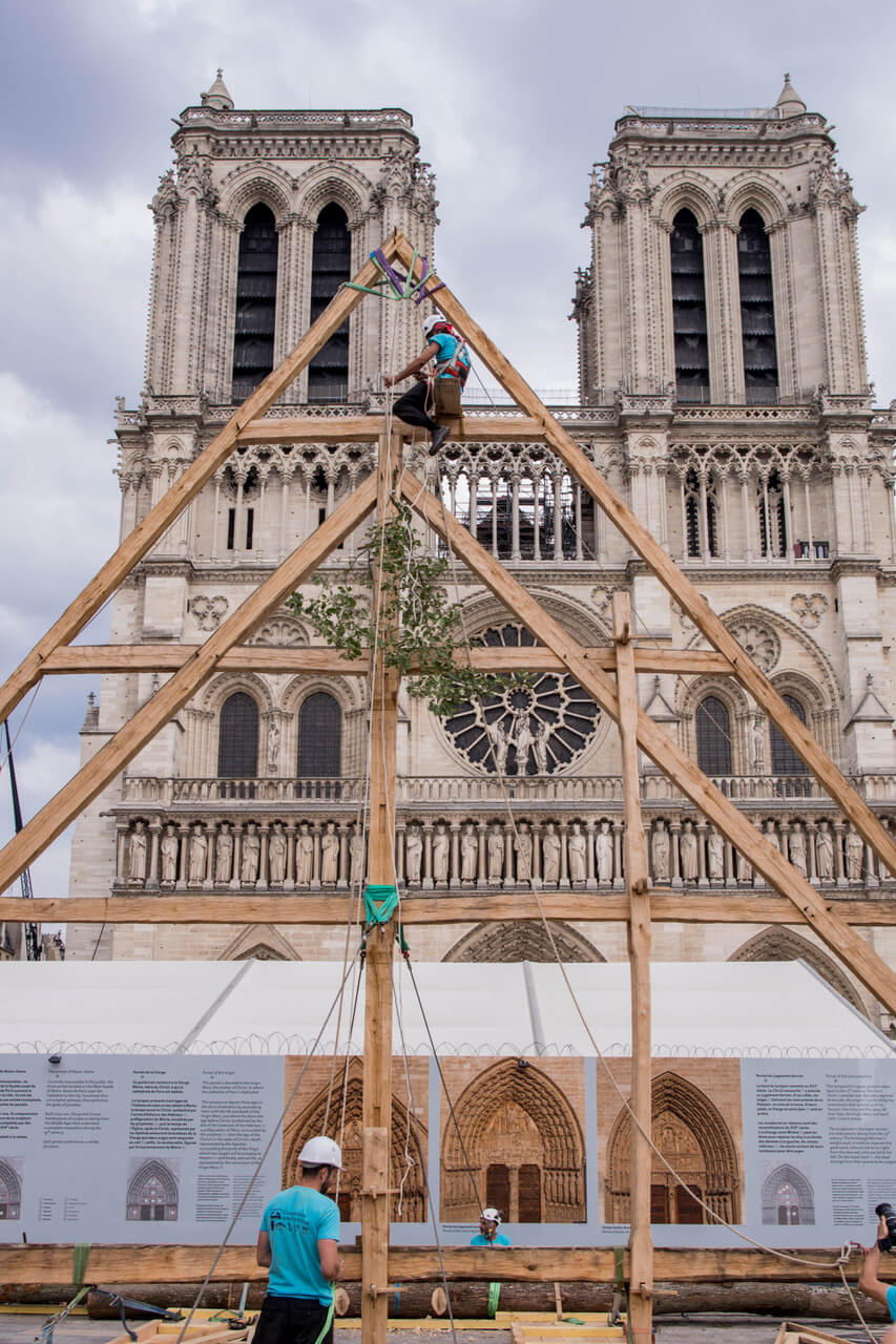 Au lendemain de l’incendie de Notre-Dame, CsF a proposé son expérience de plus de vingt ans dans le travail du bois vert à l’outil à main. Avec France Bois Forêt, CsF a pu choisir une vingtaine de chênes de qualité pour la reconstitution expérimentale d’une ferme gothique. En janvier 2020, ce fut l’abattage. En juillet, 25 charpentières et charpentiers professionnels ont retaillé en une semaine la ferme 07. Les techniques manuelles ont fait la preuve de leur efficacité. Au vu de la qualité d’exécution et du succès de ce chantier, CsF a renouvelé la démonstration de levage de la ferme aux Journées européennes du patrimoine sur le parvis de la cathédrale, en présence du général Georgelin et du public. CsF a été invité à rendre en décembre une proposition technique à l’appui du rapport de la maîtrise d'œuvre de Notre-Dame de Paris.