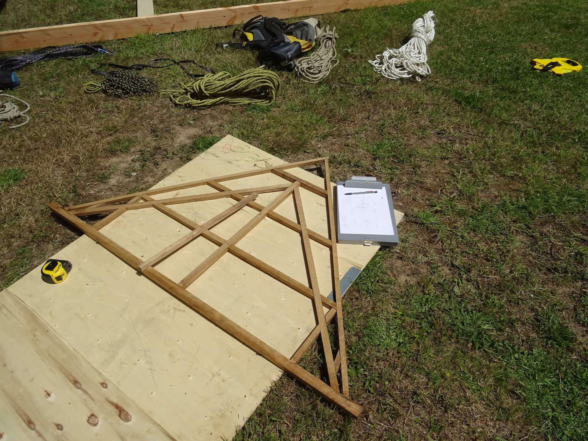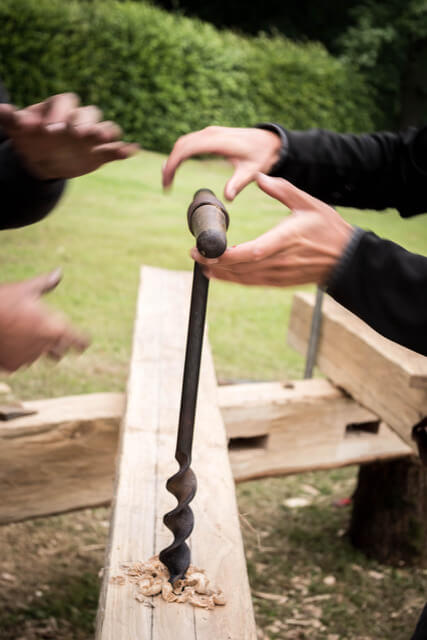 During this workshop, we explored two methods of working up timbers into frames. Some timbers were squared up by axing and finished with the breitbeil, the short-handled German broadaxe. Other timbers, were prepared by trestle-sawing. We reconstructed two barn gables during the project, ready for their infill of wattle and daub which was completed later.